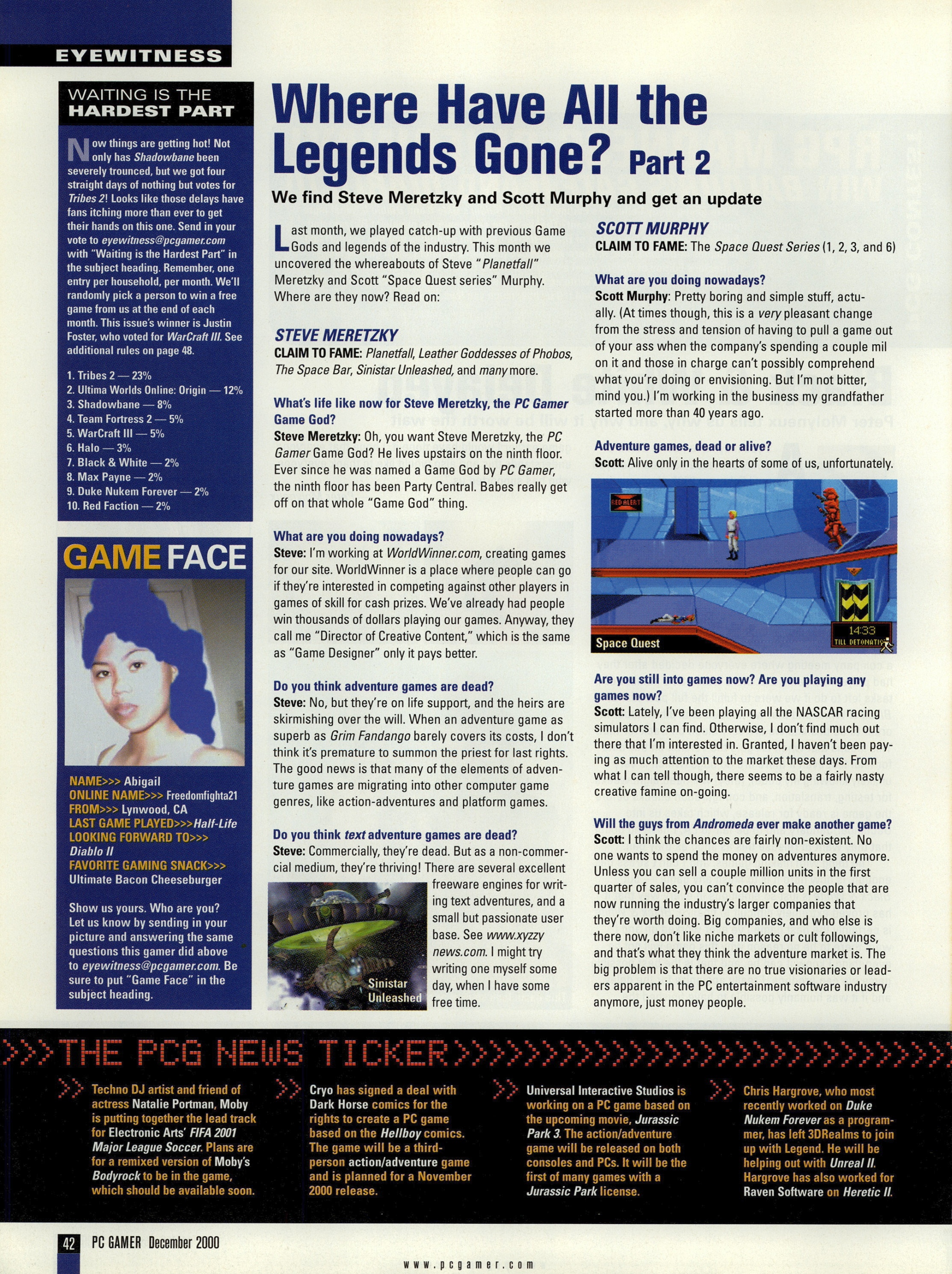 - Scott Murphy: Where Have All the Legends Gone? (PC Gamer, December 2000)