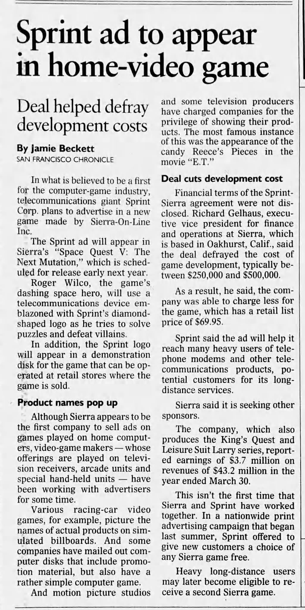 - Sprint Ad to Appear in Home Video Game (Atlanta Journal, December 1992)