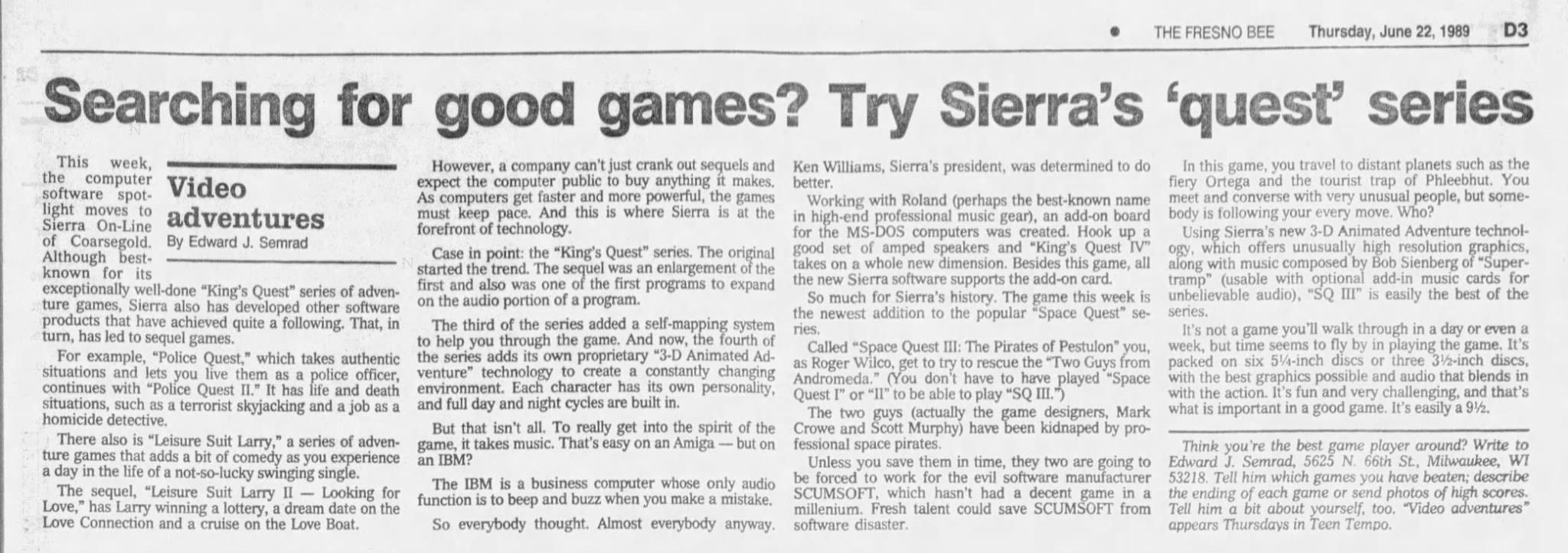 - Searching for Good Games? Try Sierra's "Quest' Series (The Fresno Bee, June 1989)