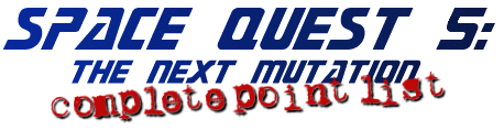 Welcome to the complete point list for Space Quest 5: The Next Mutation. This file provides all the possible points for SQ5. The Broomcloset also has a SQ5 walk-through available. If you have any corrections or additions, please e-mail me.